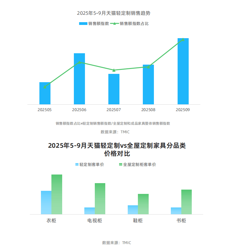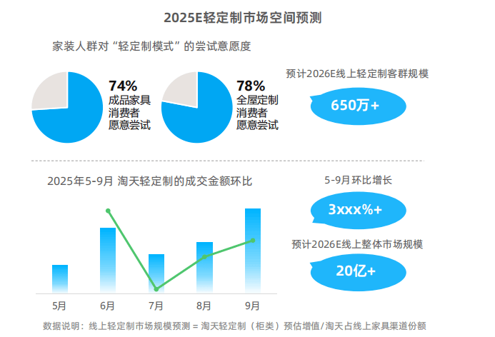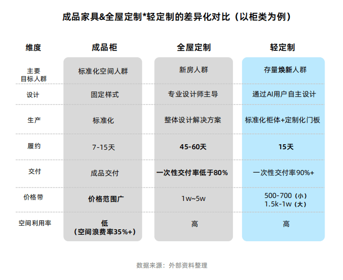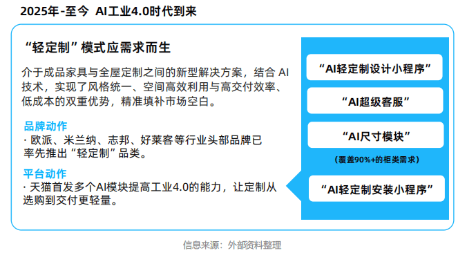 消费者的需求变化间接反映正在对现状的不满上。天猫于2025年11月5日正式推出“轻定制”概念,并自从选择外不雅、调整内部结构。个性化定制取旧改市场正构成新的行业共识。显著减轻了用户正在时间、流程、决策及价钱上的分析成本。现在行业全体面对“获客难、成本高、同质化合作”的窘境!